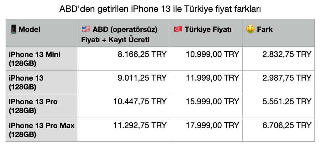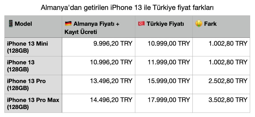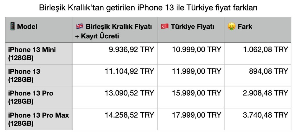 Mini modeli için fark 2000 TL seviyelerinde iken iPhone 13 Pro Max modelinde fark 6000 TL’ye kadar çıkıyor.